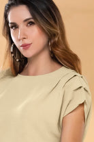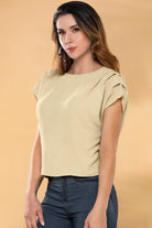 Blusa de silueta amplia confeccionada en un tejido plano texturizado en un delicado color crema. Destaca por sus elegantes pliegues en el hombro, añadiendo un toque de sofisticación a tu look casual.