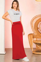 Aporta estilo y sofisticación a tu outfit con esta falda larga roja en tejido stretch, una prenda diseñada para ofrecer flexibilidad. Su tejido elástico se adapta suavemente al cuerpo, permitiendo libertad de movimiento sin perder estructura.