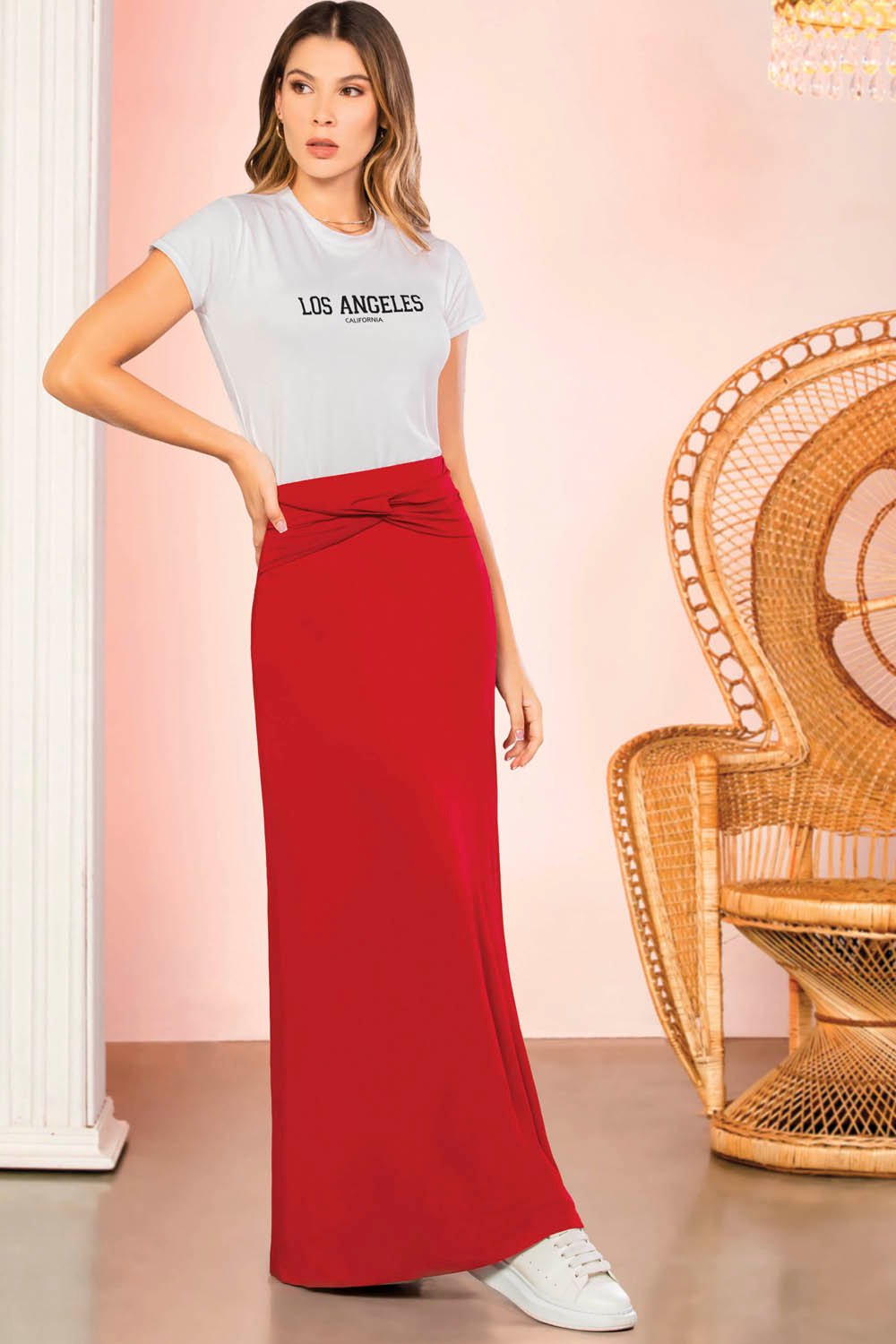 El color rojo, elegante y vibrante, convierte esta falda en una pieza protagonista ideal. Una opción esencial para destacar con seguridad y estilo.