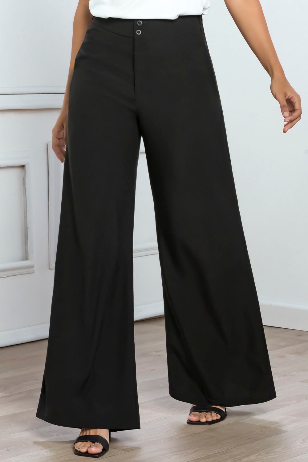 Pantalón en crepé stretch de tiro medio, con silueta amplia y bota ancha que estiliza la figura. Su diseño clásico y elegante lo hace ideal para looks formales o sofisticados, sin sacrificar comodidad.