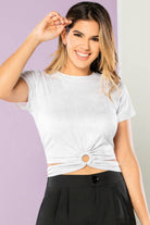 Blusa blanca corta, diseñada con un llamativo anillo anudado en el centro que realza la silueta y crea un detalle focal elegante y femenino. Su tela con efecto brillante aporta un acabado sutilmente luminoso, ideal para elevar cualquier outfit con un toque chic.