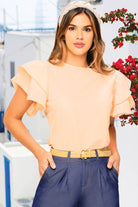 Blusa en popelina color curuba, un tejido estructurado que mantiene su forma y ofrece una apariencia pulida durante todo el día. Su tono cálido ofrece un toque distintivo, mientras que la manga en boleros aporta volumen y elegancia.
