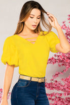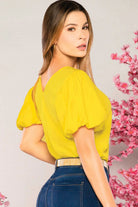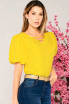 Ilumina tus looks con esta blusa en vibrante color amarillo, un tono lleno de energía que aporta frescura y realza cualquier outfit. Su diseño incorpora manga bomba, aportando volumen y un toque moderno que estiliza la parte superior del cuerpo.