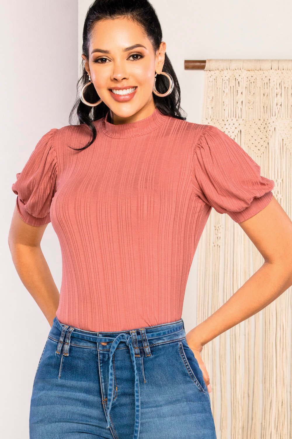 Blusa en rib stretch, un tejido suave, elástico y de textura acanalada que se ajusta al cuerpo con comodidad y define la silueta. Su cuello alto aporta un toque sofisticado, mientras que la manga globo añade volumen y feminidad, creando un equilibrio perfecto entre modernidad y elegancia.