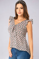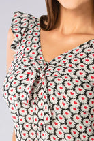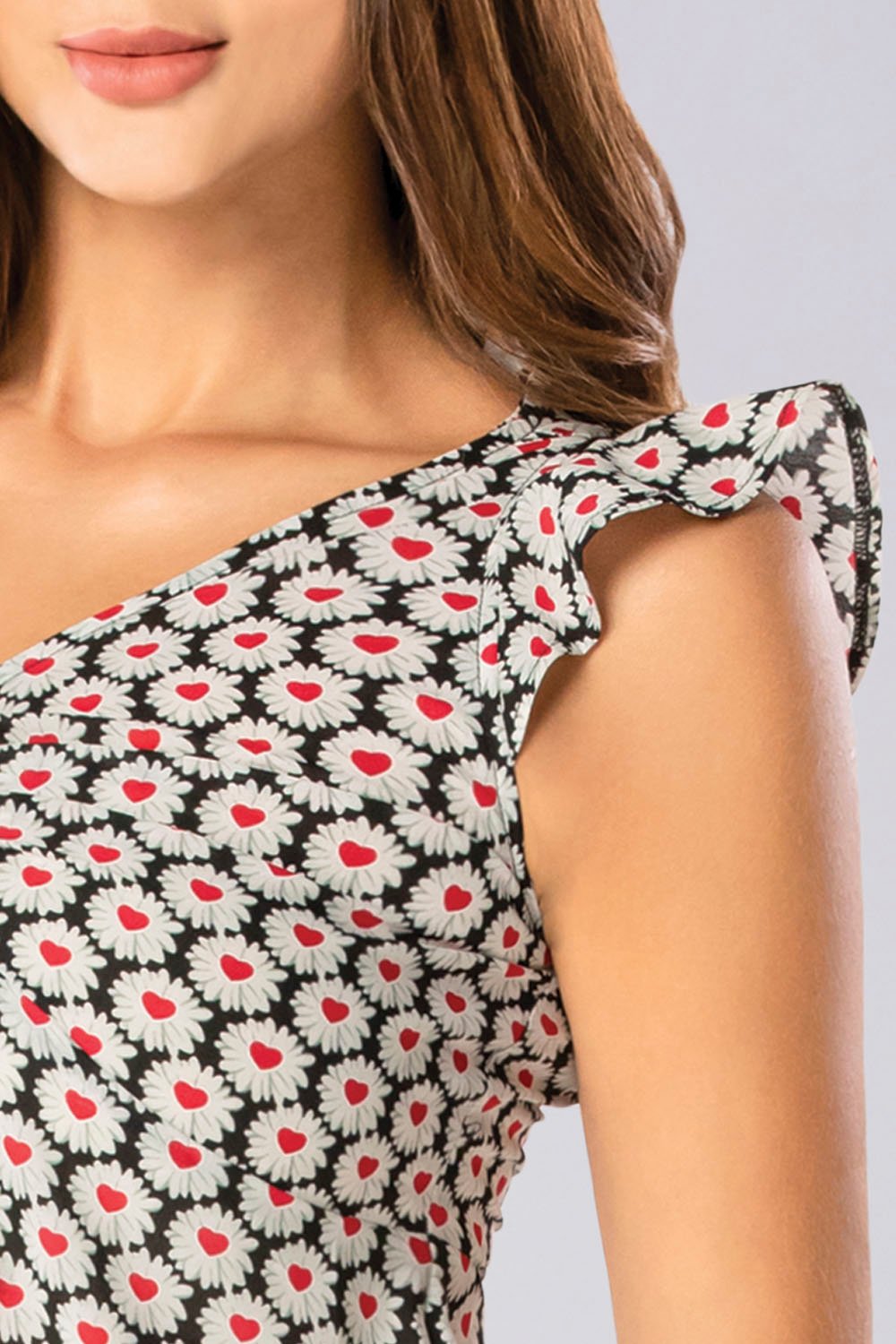 Blusa en tela crepé con delicado estampado de corazones, diseñada con un femenino nudo en el escote que aporta un toque romántico y sofisticado. Ideal para darle frescura y encanto a tu día a día.