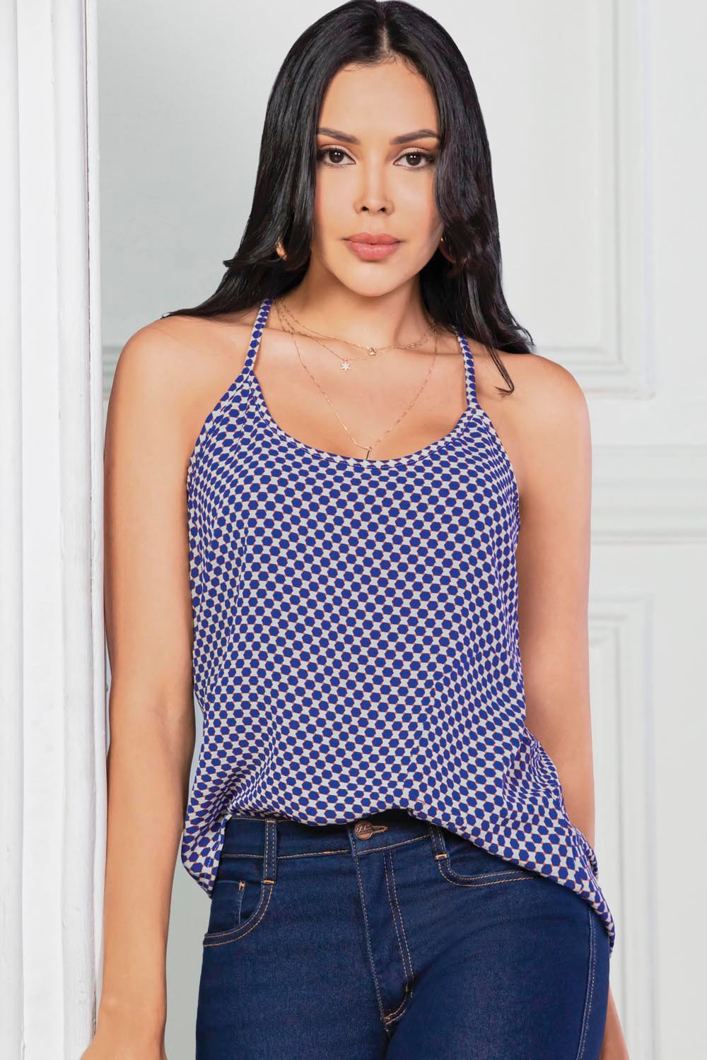 Blusa ligera con tiras delgadas y estampado geométrico perfecta para un look casual, moderno y fresco. Confeccionada en tela crepé, se adapta con suavidad al cuerpo y brinda libertad de movimiento.