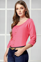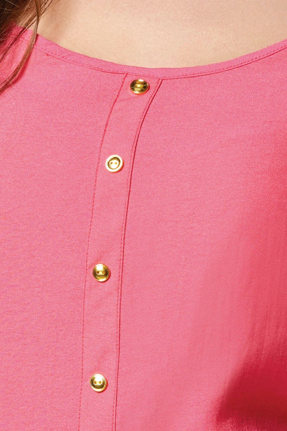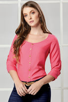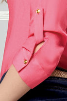 Blusa en tejido plano chalis con botones dorados, escote ligeramente caído, con charreteras en mangas 3/4.