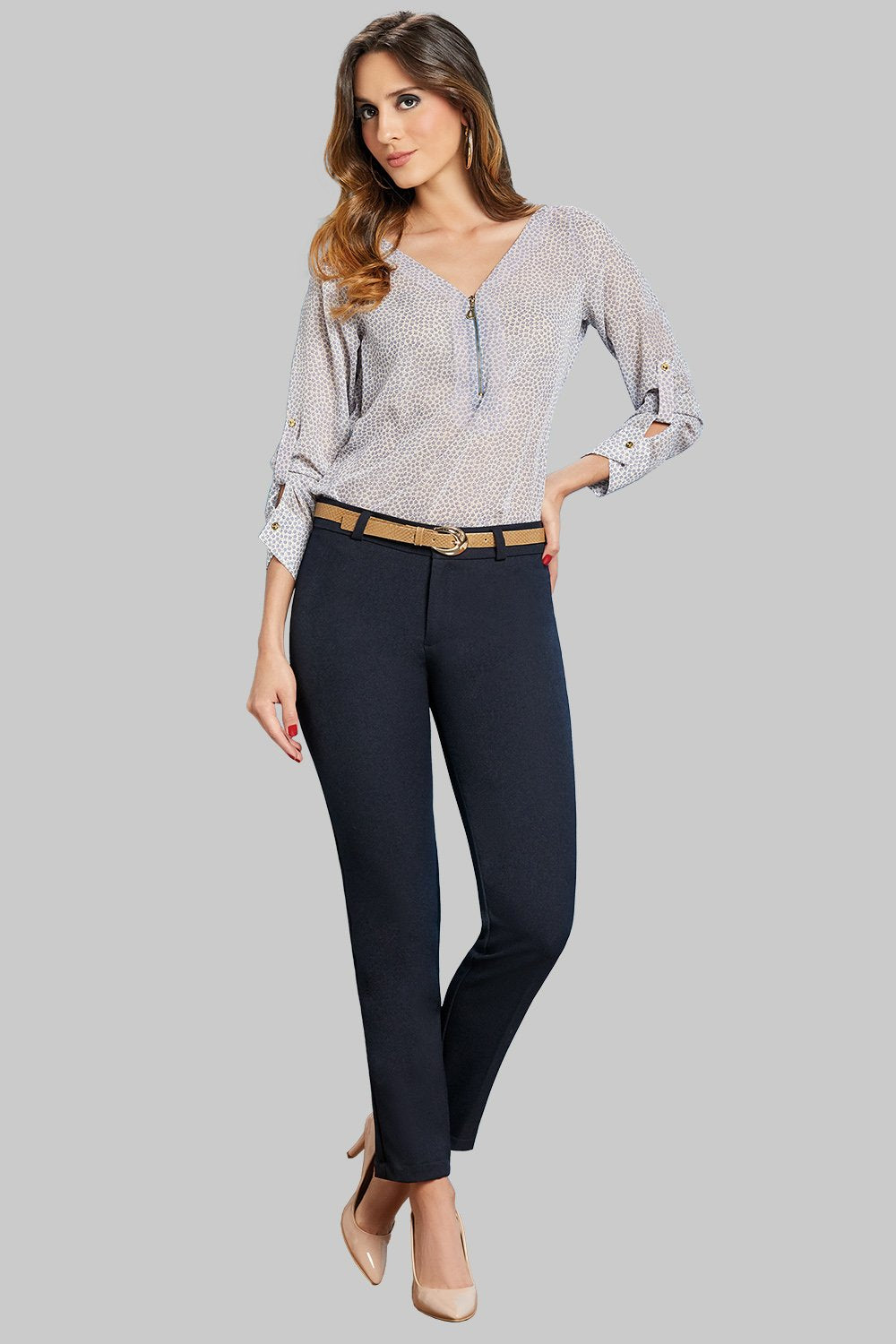 Apuesta por la comodidad y la versatilidad con este pantalón de tiro medio en gabardina, una prenda clásica que combina resistencia y una estructura impecable. Su textura característica aporta un acabado limpio y pulido.